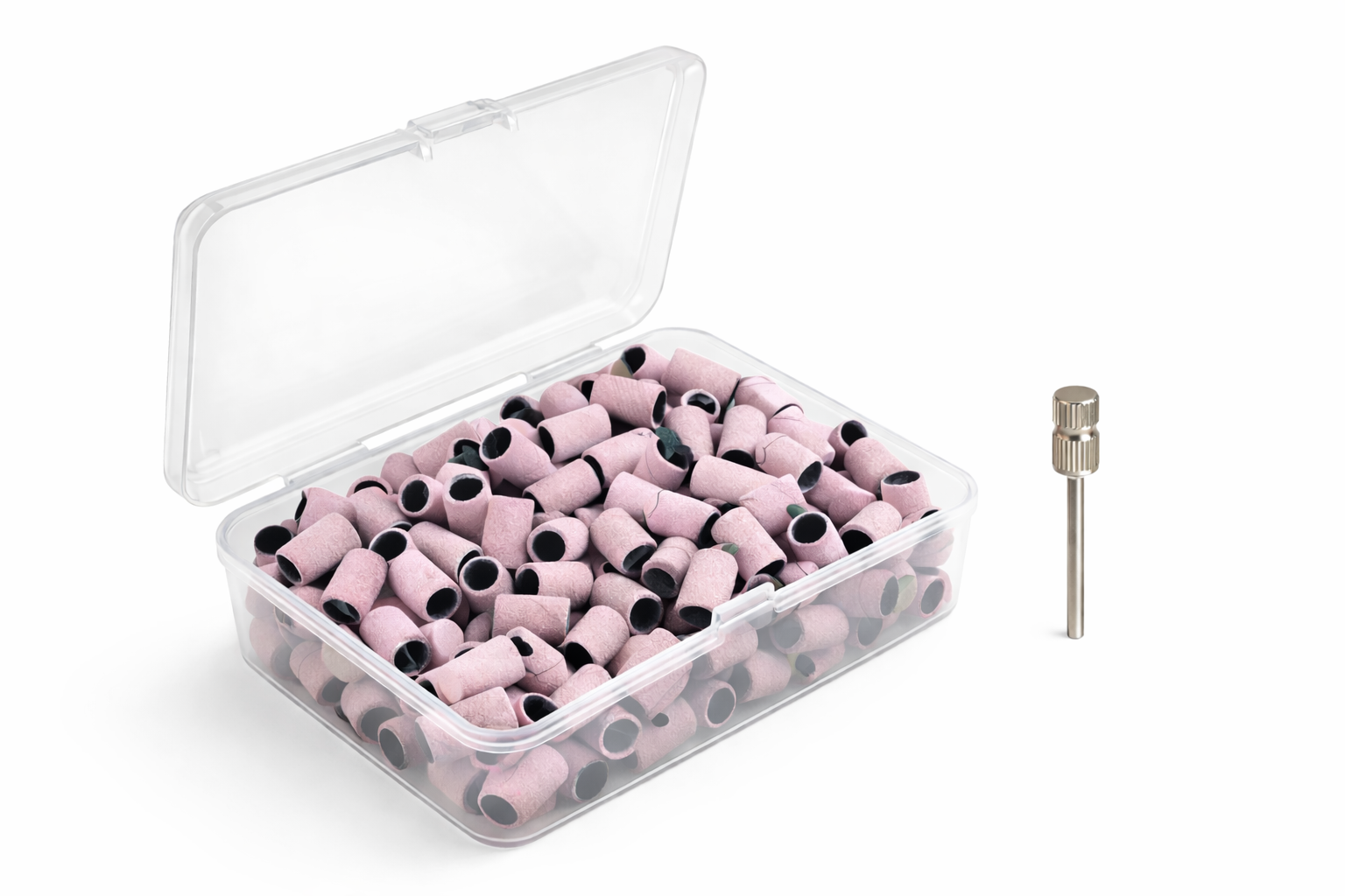 Sono all'interno di una scatola in plastica rigida e trovi all'interno 100 cilindretti e 1 mandrino.